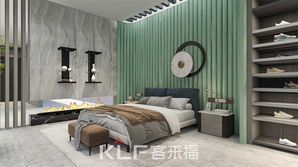 柵欄式背景設計塑造空間的線條感,灰色磚紋背景色的搭配加上具有藝術感的掛件,放大了空間的視覺效果。L型的衣帽間安排,衣帽間皮紋門板的運用低調奢華。采用阻尼軌道,在抽拉時光滑不受阻,給拉開抽屜時順滑的享受。