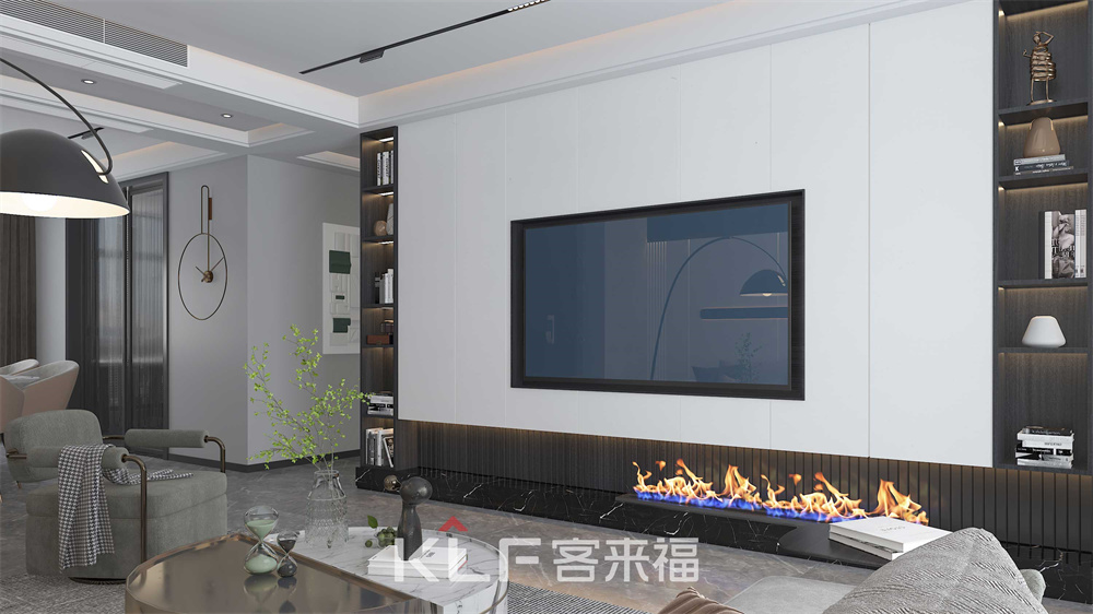 電視墻雖簡(jiǎn)約質(zhì)樸,但也正因如此給整個(gè)客廳渲染出高端大氣的氛圍。兩邊的墻柜增加收納的功能,底部的火爐效果給空間帶去一絲生機(jī)活躍之感。