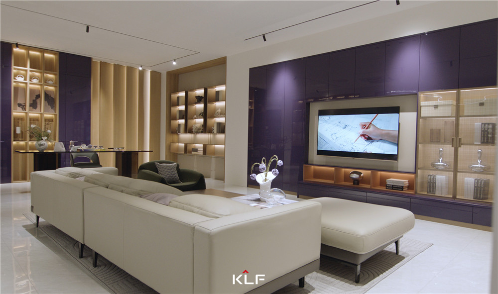 客廳采用圍合式布局,一側(cè)墻壁做鏡面處理,與柜體進(jìn)行模塊化組合;矩陣成型的柜體紫棠色映入眼簾,活潑且高級;烤漆門板順滑且頗賦光澤感,展現(xiàn)出客來福的創(chuàng)意工藝。