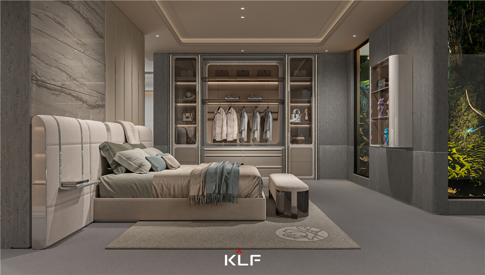 臥室背景墻以高級灰為主,金屬線條裝飾,營造出悠閑的空間氛圍;衣柜背板采用了客來福LOGO 標(biāo)志實木雕刻板,頗具特色;兩邊配透明玻璃門對開門,方便換衣、打扮。